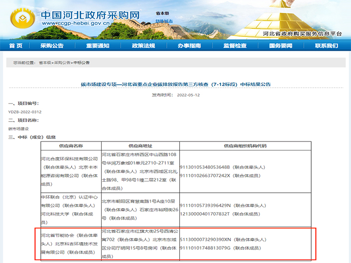 2022年5月12日,河北省政府采購網(wǎng)公布了“碳市場建設(shè)專項—河北省重點(diǎn)企業(yè)碳排放報告第三方核查(7-12標(biāo)段)”中標(biāo)結(jié)果公告,科吉與河北省節(jié)能協(xié)會組建的聯(lián)合體成功中標(biāo)。 科吉是國內(nèi)最早從事重點(diǎn)排放單位碳排放核查...