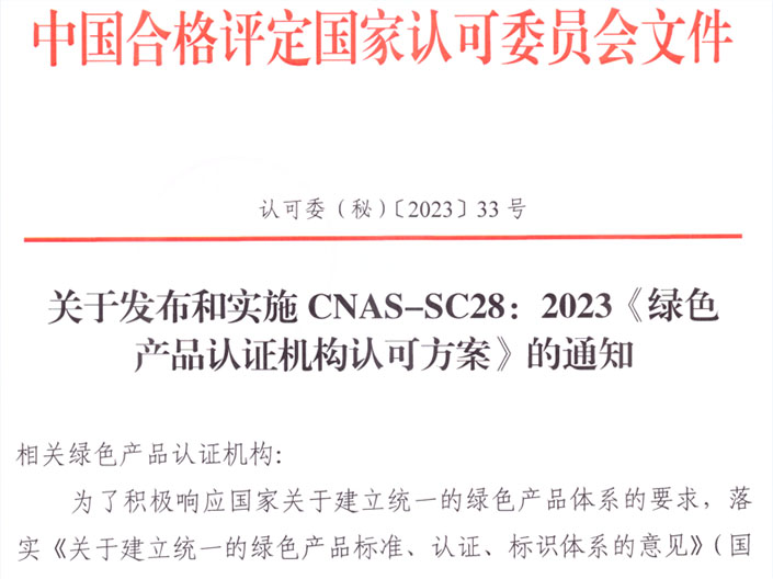 為發(fā)揮認(rèn)可技術(shù)在綠色產(chǎn)品認(rèn)證監(jiān)督機(jī)制中的技術(shù)約束和證實(shí)能力的作用,中國(guó)合格評(píng)定國(guó)家認(rèn)可委員會(huì)(CNAS)秘書處組織制定了CNAS-SC28:2023《綠色產(chǎn)品認(rèn)證機(jī)構(gòu)認(rèn)可方案》,該文件已于2023年4月1日正式發(fā)布,并將于2...